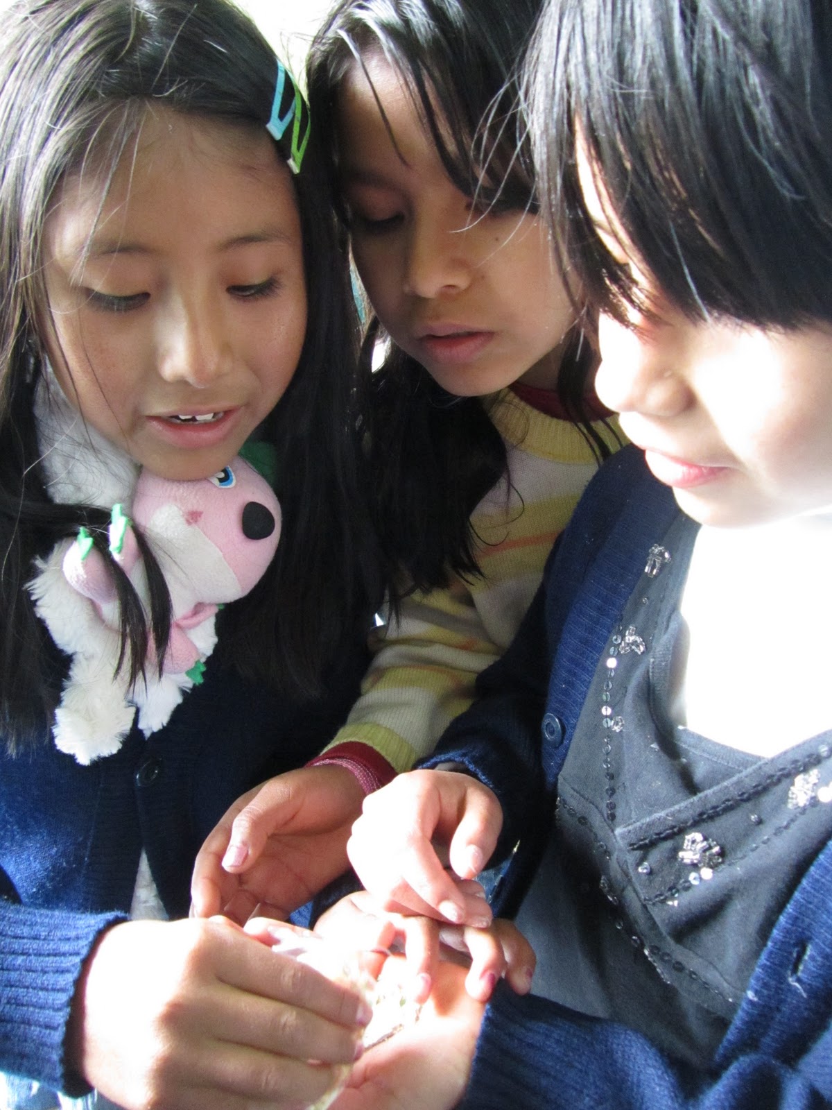 | Evelyn, Vanesa, and Jhoselin feeding the fish at Parque Mariscal. |